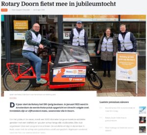 Dit jaar viert de Rotary het 100-jarig bestaan. In januari 1923 werd in Amsterdam de eerste Rotaryclub opgericht en Utrecht volgde snel. Inmiddels zijn er vijfhonderd clubs, waaronder die in Doorn. Om het jubileum te vieren, wordt een 5000 kilometer lange emissieloze estafette gereden met een bakfiets en ‘gouden schep’ langs alle clublocaties. Elke club organiseert daar een programma omheen. De estafette eindigt in december in Hulst, waar met de schep een jubileumbos wordt aangeplant. Afgelopen weekend werd de fiets via Veenendaal en Leersum.